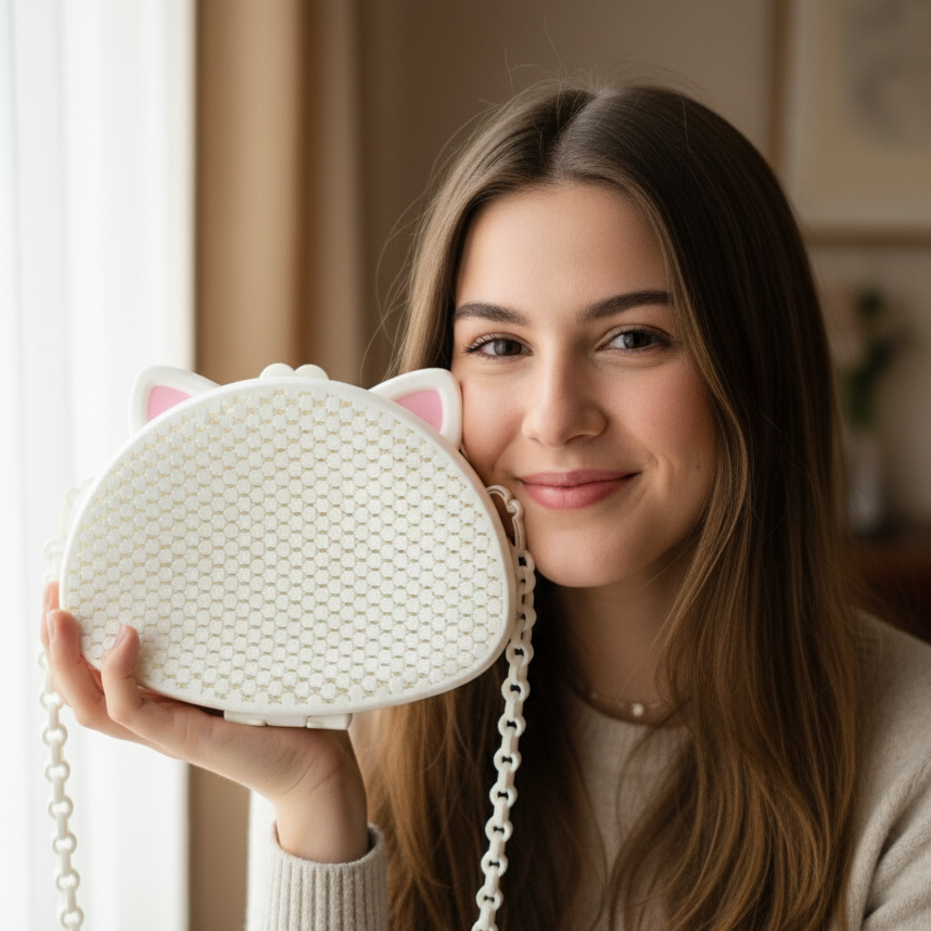 Ez az egyedi cica alakú táska tökéletes választás mindazoknak, akik szeretik az aranyos és praktikus kiegészítőket. A fehér színű táska rózsaszín fülekkel és különleges textúrált felülettel készült.
